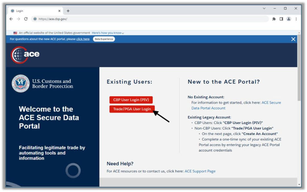 Access the ACE Portal. Log into the ACE Secure Data Portal and verify that your account permissions are active and ready for CAPE submissions.